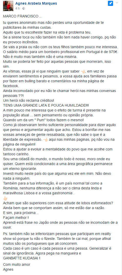 Entretanto, Agnes voltou à carga e atacou o bombeiro Marco Francisco, acusando-o de querer “anonimato mas não perdes uma oportunidade de te publicitares às minhas custas.“