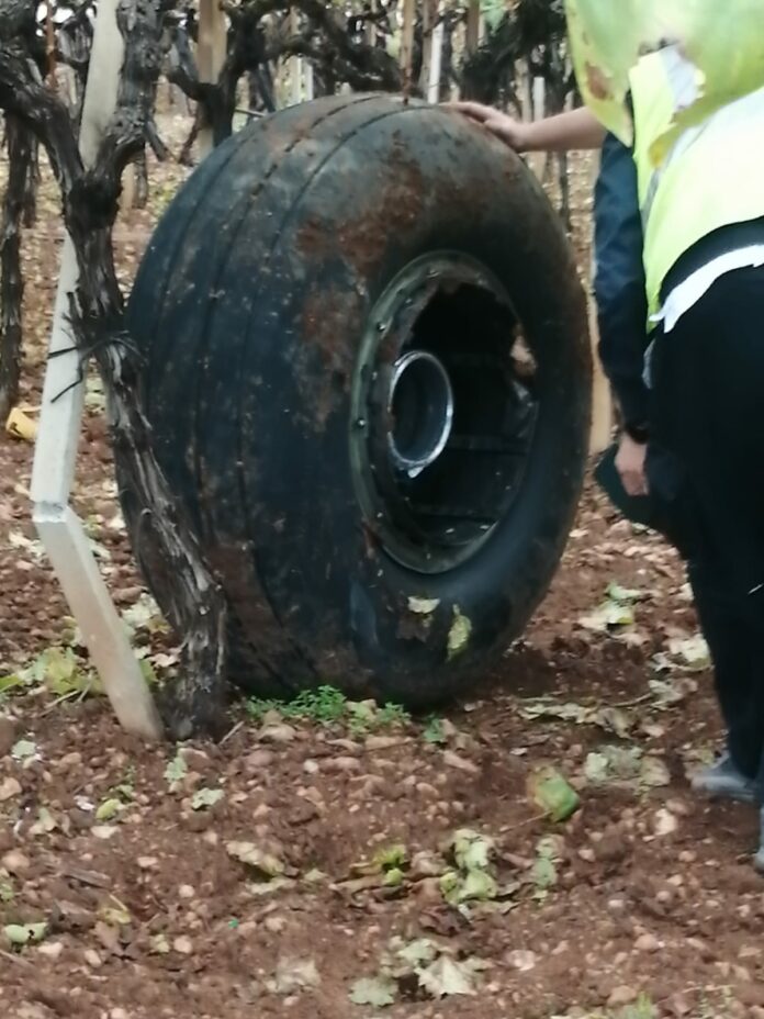 Para complicar as coisas, a roda desprendeu-se do trem de aterragem e saiu a voar até atingir a pista, acabando por parar numa plantação próxima do aeroporto.