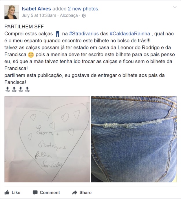 É um caso pouco comum, e que temos que ajudar a solucionar. Isabel Alves comprou uma calças de ganga na loja Stradivarius nas Caldas da Rainha. Quando chegou a casa e vestiu novamente as calças, encontrou um papel no bolso de trás.