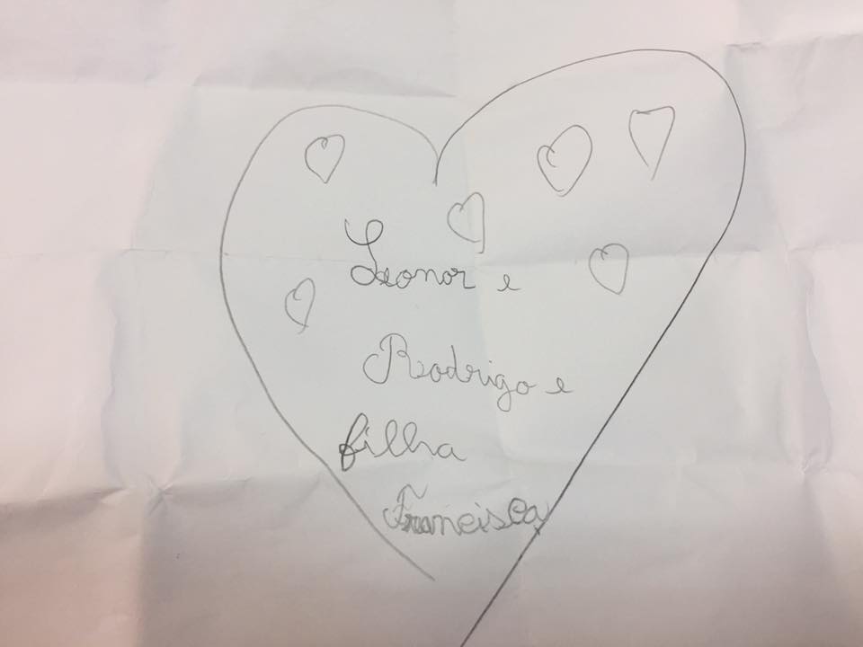 No bilhete está um desenho feito por uma criança, e pelo desenho a mãe chama-se Leonor, o pai é Rodrigo, e a Francisca a filha, e autora do bilhete…