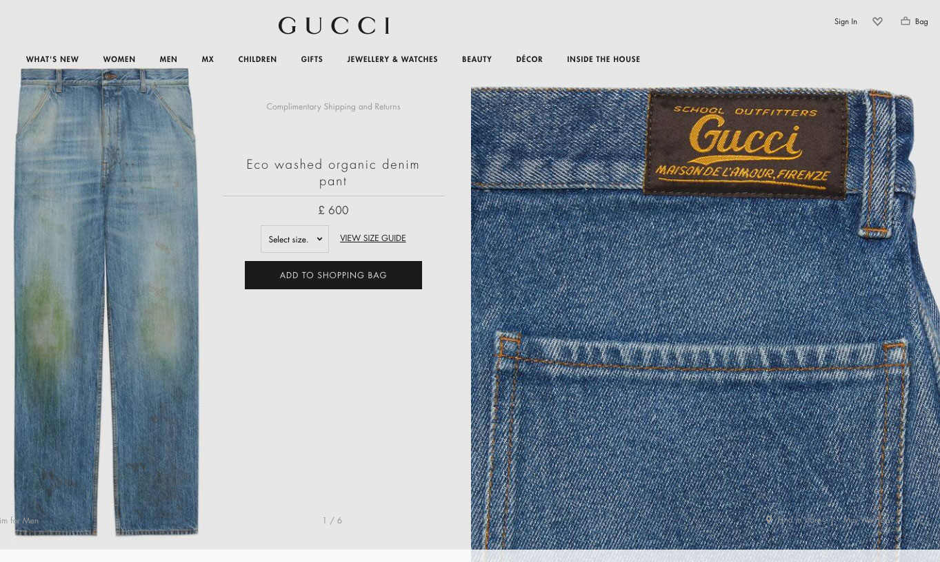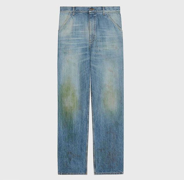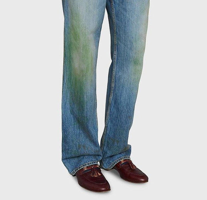 A Gucci colocou à venda umas calças de ganga com manchas falsas de erva nos joelhos a um preço de 600 libras (aproximadamente 650 euros ao câmbio atual).