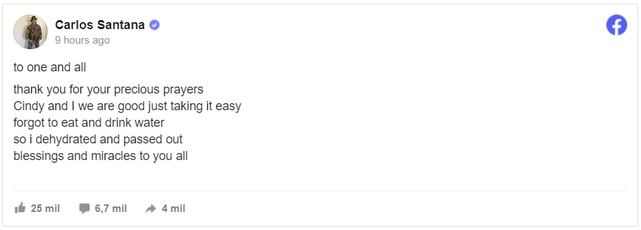 Horas mais tarde, Carlos Santana fez uma publicação na rede social Facebook de forma a tranquilizar os fãs preocupados. “Esqueci-me de comer e beber água, portanto fiquei desidratado e desmaiei”, explicou.