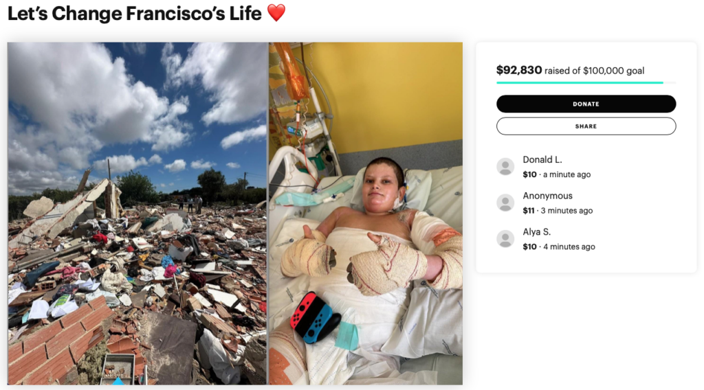 A tragédia que destruiu a vida de Francisco aconteceu a 26 de junho. A explosão, originada por uma fuga de gás butano, matou a mãe e a irmã no local, enquanto o pai ainda foi levado ao hospital, mas não resistiu aos ferimentos. Hoje, Francisco vive com os tios e enfrenta um longo caminho de recuperação, agora com o apoio e solidariedade de milhares de pessoas.