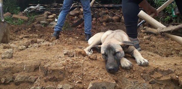 Durante vários dias, bombeiros e voluntários trabalharam para resgatar vítimas, localizar corpos, e começar a limpar e reconstruir os locais afectados. Este cão não abandonou o local onde o dono perdeu a vida, soterrado na sua própria casa.