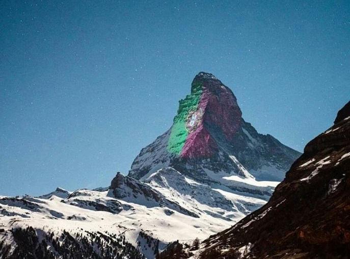 A montanha de Matterhorn, na Suíça, é iluminada todas as noites com mensagens de esperança. Uma das mensagens surgiu através da bandeira de Portugal, que foi projetada na famosa montanha dos Alpes, considerada “a mais fotografada do mundo”.