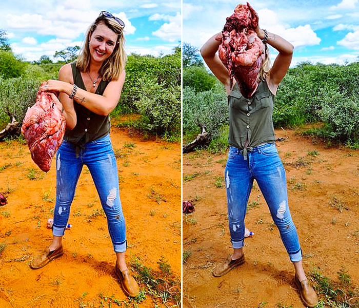 Merelize então posou com o coração do animal e postou as imagens horríveis na sua página do Facebook, gabando-se de estar “nas nuvens” com o presente.