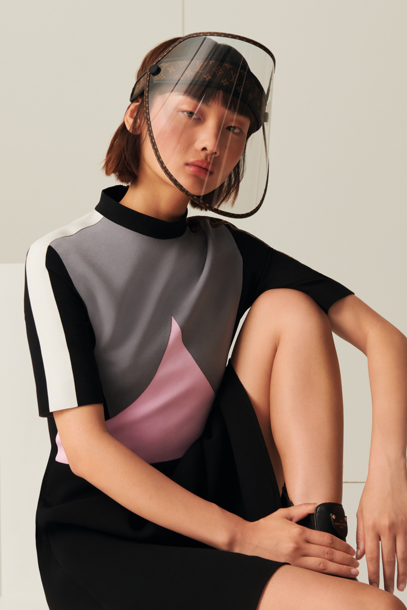A viseira da Louis Vuitton, chamada LV Shield, apresenta tachas douradas gravadas, uma fita monograma, e uma viseira fotocromática que escurece ao primeiro sinal de sol. A viseira também pode ser levantada até o topo da cabeça para ser usada como uma pala ou boné.